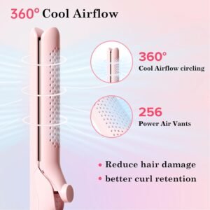 Hair Straightener Curler 2-in-1: 1.25″ Flat Iron for Women – Curling Wand 360° Airflow Cooling Vents Titanium Ionic for Less Frizz – 5 Temps & Auto Off Dual Voltage (Pink)