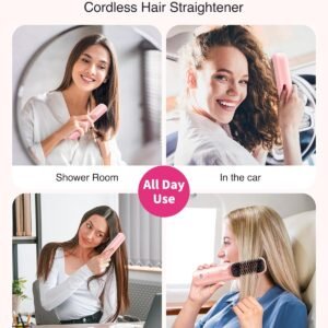 Cordless Hair Straightener Brush – Portable Hair Straightening Brush for Travel – 300M Negative Ions for Frizz-Free Shine, Touch Up On-The-Go, Fast Heating, Gift for Women, 10,000mAh, Powder Pink